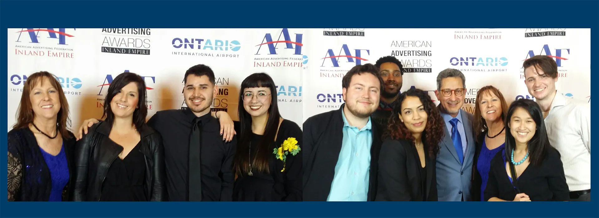 Cal State San Bernardino’s Coyote Radio & Advertising continued its tradition of excellence at the annual American Advertising Federation Inland Empire “ADDY” Awards Gala, winning 10 awards in the professional category. The students who comprise Coyote Radio & Advertising, housed in CSUSB’s College of Arts and Letters, competed against commercial advertising agencies and companies in the Inland Empire market of 4 million people. Coyote Radio & Advertising is unique in that the department creates advertising pieces for the CSUSB’s colleges, departments, resource centers and other entities on campus, essentially serving as an “in-house” advertising agency. The awards were given at the gala, held at the Historic Mission Inn in Riverside, on March 15. Advertising pieces for the CSUSB Division of Information Technology Services produced four winning entries. They were the Faculty and Staff Resource Guide, The Student Resource Guide, the Coyote OneCard, and an award was given for copy writing the ITS blog article on “ATI’s Immersive Technologies: VR.” Other award winners were: The College of Education’s “End of the Year Solicitation Letter,” PDC’s Paws Radio promotional poster, the John M. Pfau Library’s NASA campaign, the Human Resources Department’s “PAWS for Learning” logo creation, and the RAFFMA promotional video for its “Calafia” exhibit. The tenth award was given to Coyote Radio & Advertising for its design of the door wrap which covers the entrance to their offices in the basement of the Pfau Library. Founded in 1905, the American Advertising Federation (AAF) is the only organization that includes members across all disciplines and career levels in advertising. The organization is dedicated to advancing careers, sharing knowledge and trends and building connections in the ever-changing advertising industry. For more information on Coyote Radio and Coyote Advertising, contact Kelli Cluque, operations manager, at (909) 537-3473 or kelli.cluque@csusb.edu.