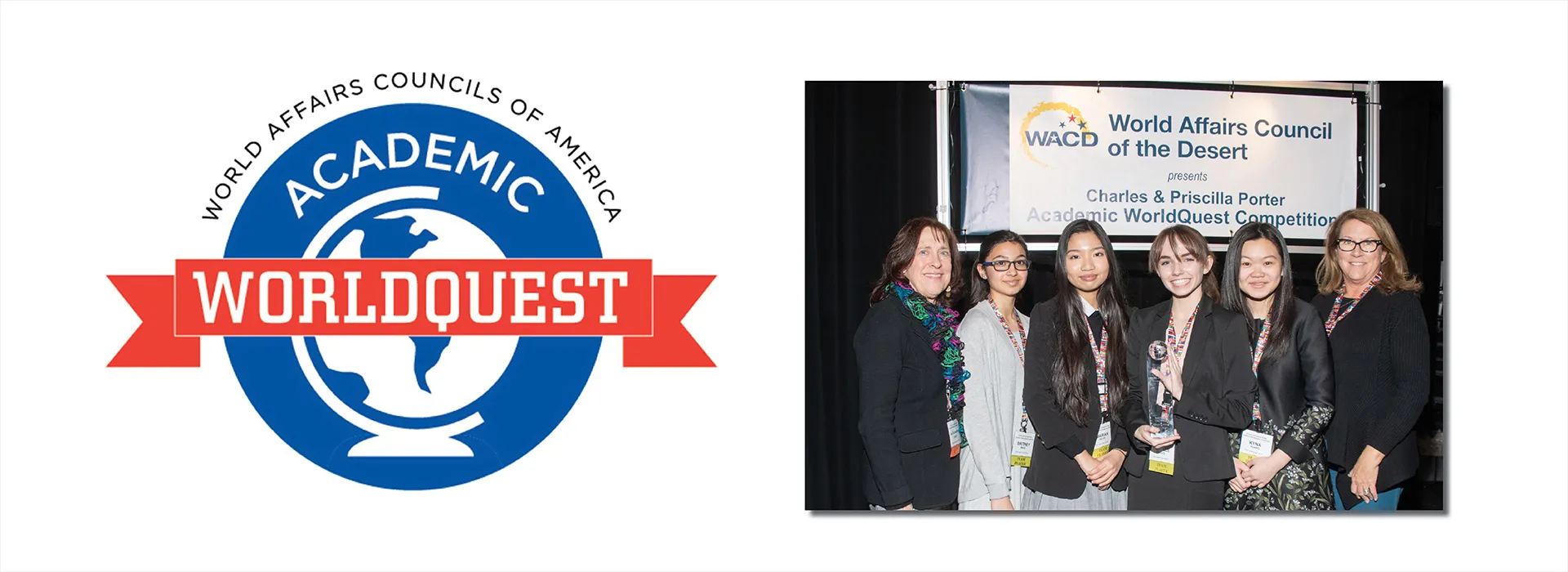 For the third year in a row, a team of students from Palm Desert High School emerged as winners from a field of 12 Coachella Valley high schools during the 14th annual Charles and Priscilla Porter Academic WorldQuest competition at Cal State San Bernardino’s Palm Desert Campus on Feb. 7. The Palm Desert High School team members included Britney Baez, Marian Felipe, Danielle Hjerpe and Kyna Huang. Xavier College Preparatory High School captured second place and West Shores High School took third place, after breaking a tie with Rancho Mirage High School. Scholarships were awarded to each student in the top three teams: first place, $300; second place, $200; and third place, $100. The most improved award went to Coachella Valley High School whose team members won $75 each. The school spirit award went to West Shores High School with the largest number of supporters in the audience. The Palm Desert High School team scored 43 out of 50, beating out Xavier College Preparatory High School by 4 points. The Palm Desert will move on to compete against other high school teams throughout the country in the National Academic WorldQuest Competition on April 27 in Washington, D.C. Sponsored by World Affairs Council of the Desert, the Charles and Priscilla Porter Academic WorldQuest is a team game that challenges the competitors’ knowledge of world affairs. The topics this year included How to Deal with North Korea, Global Refugee and Migration Crisis, Great Decisions, Space Policy and the World Trade Organization. Sarah Trott, anchor at KESQ News Channel 3, served as master of ceremony. This year’s competing high schools also included Desert Mirage High School, Desert Hot Springs High School, Indio High School, La Quinta High School, Palm Valley School, Palm Springs High School and Shadow Hills High School. Certificates of recognition were presented to all teams by World Affairs Council of the Desert, the office of U.S. Rep. Raul Ruiz and the office of Riverside County Supervisor V. Manuel Perez. The competition began with a welcome from John Welty, president of World Affairs Council of the Desert. Yul Roe chaired the event, with assistance from Charles and Priscilla Porter, Karen Speros, Gordon Kramer, Lisa Corbin, Doris Wilson, Regina Garrison and 28 volunteers. Event sponsors included Palm Springs Life and Charles and Priscilla Porter as platinum sponsors; Anderson Children’s Foundation, CSUSB Palm Desert Campus and Thunderbird Country Club as gold ambassador sponsors; and College of the Desert, County of Riverside, Richard Jennings and UBS Financial Services, Inc. as silver ambassador sponsors. The CSUSB Palm Desert Campus offers bachelor’s and master’s degrees, a doctorate in educational leadership, and teacher credentials and certificates. With more than 1,400 students, it is the Coachella Valley’s four-year public university and plays a vital role in educating and training the region’s growing population. For more information about the CSUSB Palm Desert Campus, contact Mike Singer in the Office of Public Affairs at msinger@csusb.edu or (760) 341-2883, ext. 78107, or visit the campus website at pdc.csusb.edu.