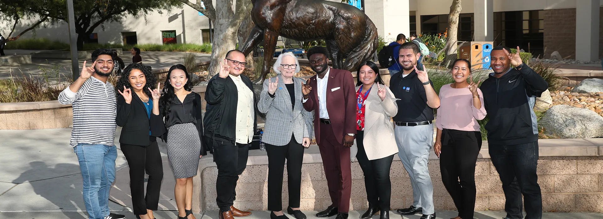 Jean Picker Firstenberg, a member of the California State University Board of Trustees, visited Cal State San Bernardino on Tuesday, Nov. 27, to meet with university students, faculty, staff and administrators.Firstenberg was welcomed by Tomás D. Morales, CSUSB president, and met with Shari McMahan, provost and vice president for Academic Affairs; Doug Freer, vice president for Administration and Finance; Ron Fremont, vice president for University Advancement; Robert J. Nava, incoming vice president for University Advancement; and Sam Sudhakar, vice president for Information and Technology Services. Her itinerary at CSUSB included a tour of the campus that included visits to the Obershaw DEN Food Pantry, the Robert and Frances Fullerton Art Museum, the CSUSB Cybersecurity Center and the Performing Arts Center. After lunch with student leaders, she met with the Faculty Senate Executive Committee and the Staff Council. Photos by Robert A. Whitehead/CSUSB and the Obershaw DEN/CSUSB Office of Community Engagement