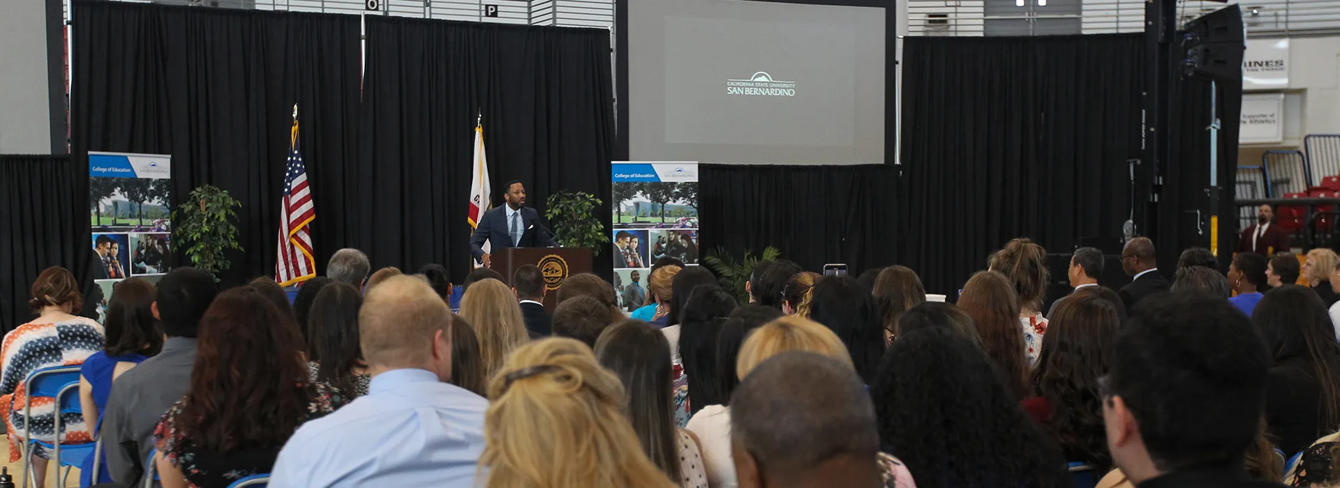 Deputy Provost Clare Weber gave the welcome address to the students and about 550 family, friends and supporters in attendance, along with a speech by Jake Zhu, the interim dean of the College of Education. The keynote address was given by Will Greer, an assistant professor in the Department of Education Leadership & Technology who received his master’s degree in education from CSUSB in 2007.