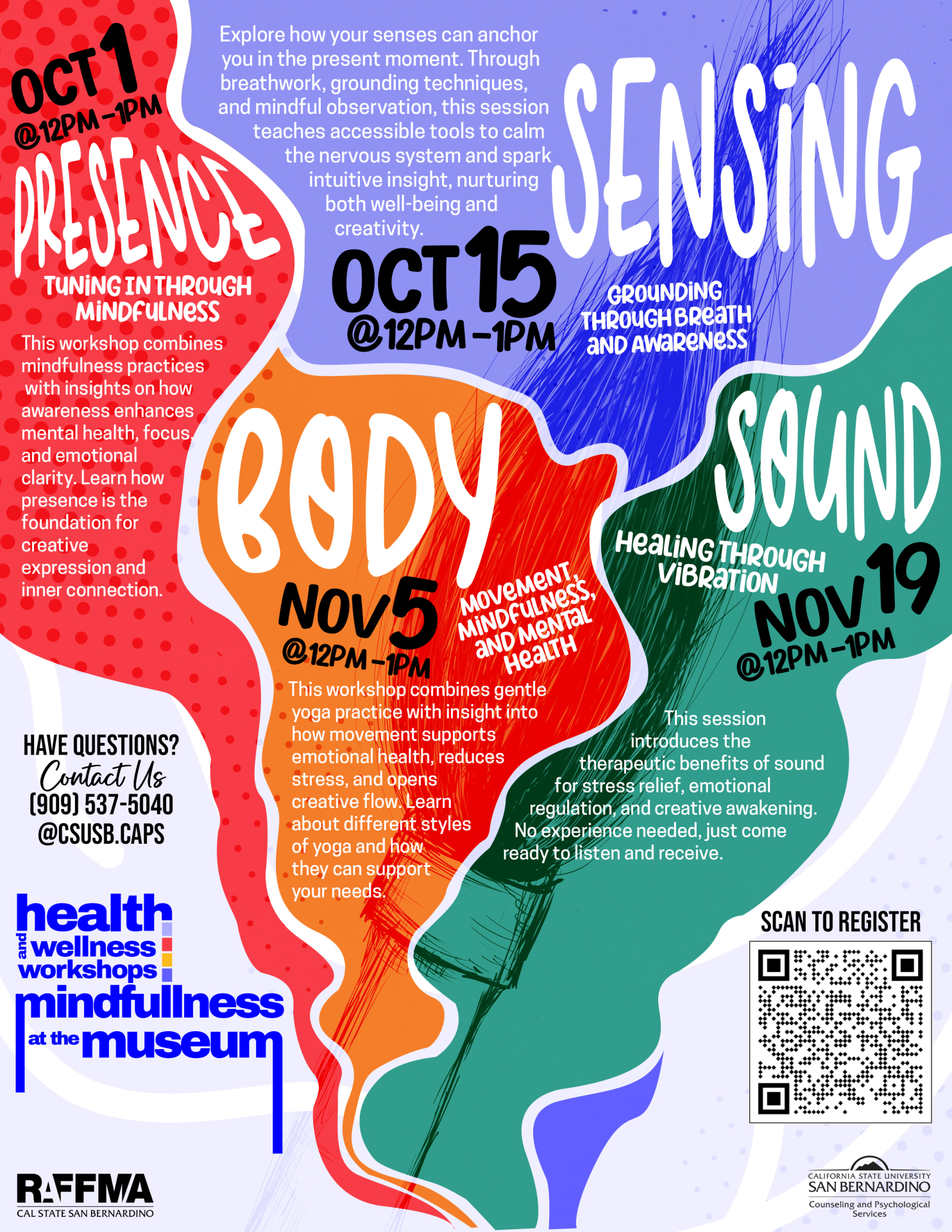The Robert and Frances Fullerton Museum of Art (RAFFMA) at Cal State San Bernardino will launch Mindfulness at the Museum, a four-part wellness series presented in partnership with CSUSB’s Counseling and Psychological Services (CAPS).