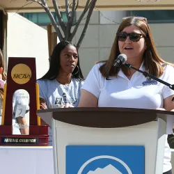The CSUSB Coyote volleyball team, which captured the NCAA Division II National Championship in December, the university’s first national title, was honored during a block party on campus on Feb. 28.