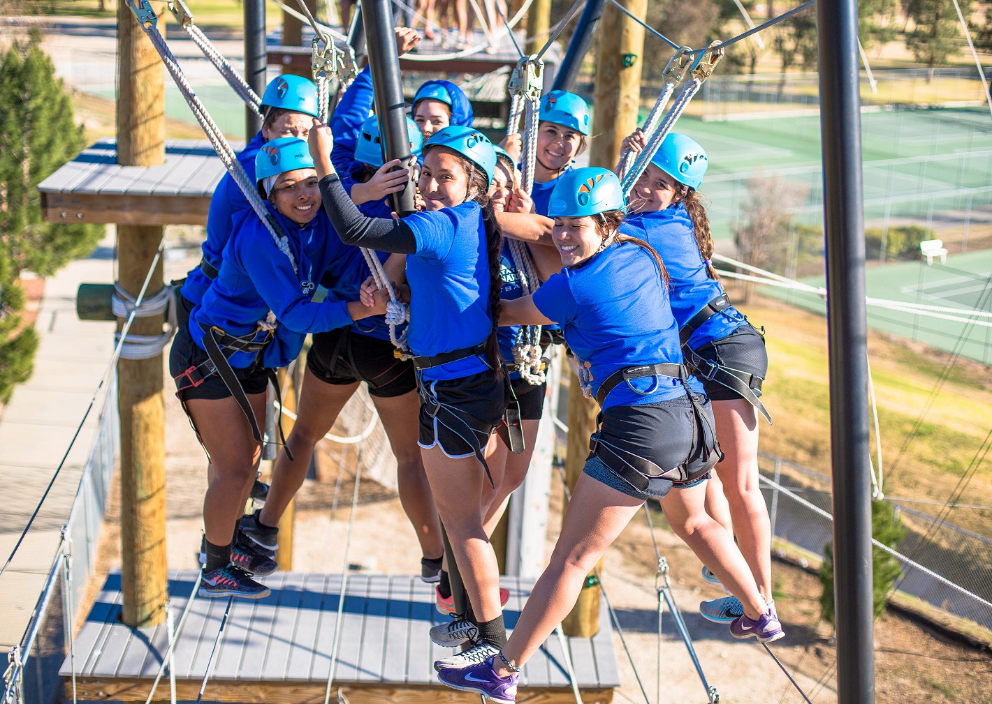 High Team Challenges - Our TEAMS course challenges are built in poles from 15 to 45 feet above the ground. Participants are encouraged to step beyond their comfort zone and attempt, rather than complete, the element. The TEAMS course allows teams of two to eight people work together to support each other in problem-solving.